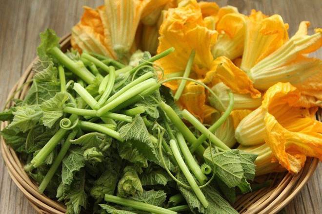 Tước sạch sơ của hoa bí và phần ngọn rau. Tước sơ đến đâu bẻ thành các khúc vừa ăn đến đó.