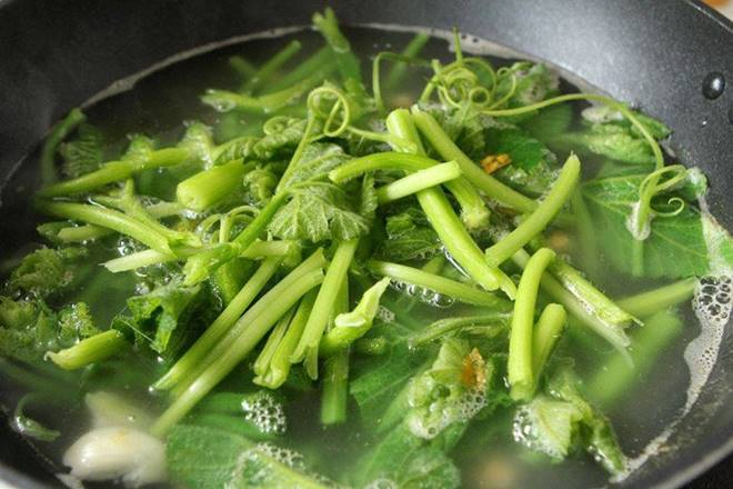 Hết 5 phút, tăng lửa, thả phần rau bí vào, khoảng 2-3 phút rau bí mềm thì thả phần hoa bí vào. Nêm muối vừa ăn.