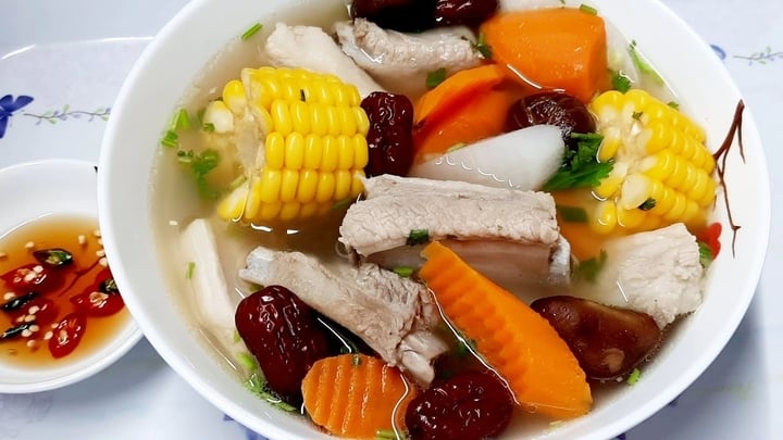 Cho sườn vào nồi, đổ nước ngập, hầm khoảng 40 phút. Thêm cà rốt, củ cải trắng, khoai tây, bắp ngô vào, nấu thêm 20 phút.