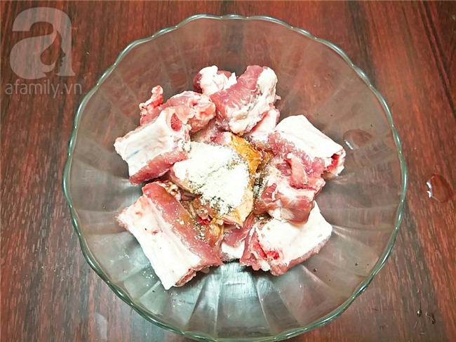 Sườn rửa sạch sẽ, thấm khô sau đó chặt miếng vừa ăn cho vào 1 cái tô, thêm chút xì dầu, xíu muối, bột nêm, tiêu và trộn đều ướp sườn 20 phút cho ngấm gia vị.