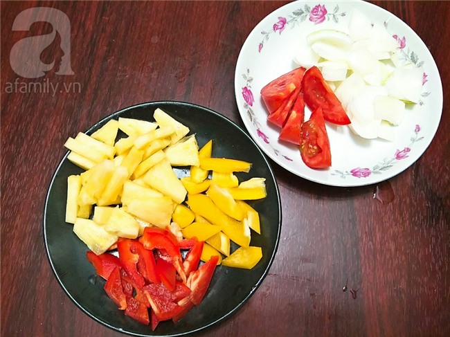 Cà chua rửa sạch thái múi cau, tỏi băm nhỏ, ớt chuông, dứa, hành tây thái miếng vừa ăn.