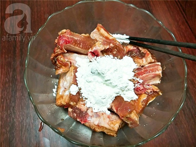 Sườn sau khi đã ướp gia vị thì cho lòng trắng trứng vào trộn đều, cho bột bắp vào sườn và xóc đều cho sườn áo 1 lớp mỏng bột bên ngoài.