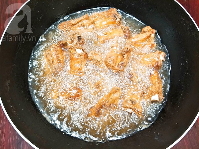 Cho nhiều dầu vào chảo đun nóng dầu sau đó gắp từng miếng sườn cho vào chiên, sườn chín vàng giòn thì vớt ra đĩa.