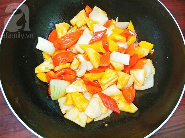 Cho chảo sạch lên bếp với 1-2 thìa dầu, đun nóng dầu mới cho tỏi vào phi thơm, sau đó cho cà chua vào xào sơ qua, thêm tương cà xào cho lên màu đỏ đẹp mới cho hành tây, ớt chuông, dứa đảo đều rồi nêm chút gia vị cho vừa ăn.