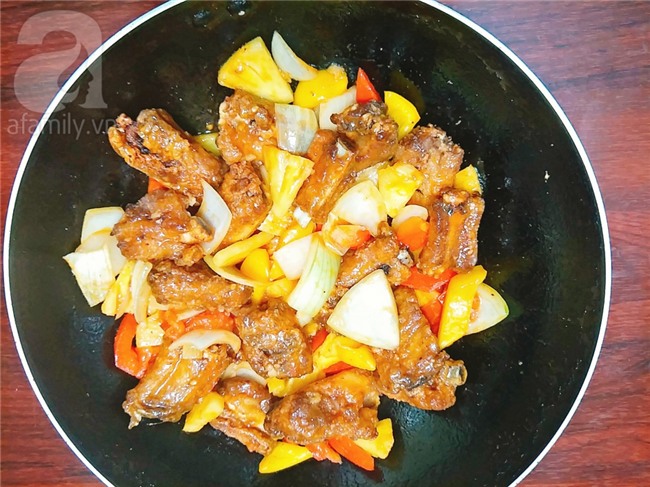 Trút tất cả sườn đã chiên giòn vào xóc đều cho sườn ngấm nước sốt là tắt bếp, xúc sườn chiên giòn sốt dứa ra đĩa và thưởng thức với cơm trắng rất đưa cơm.