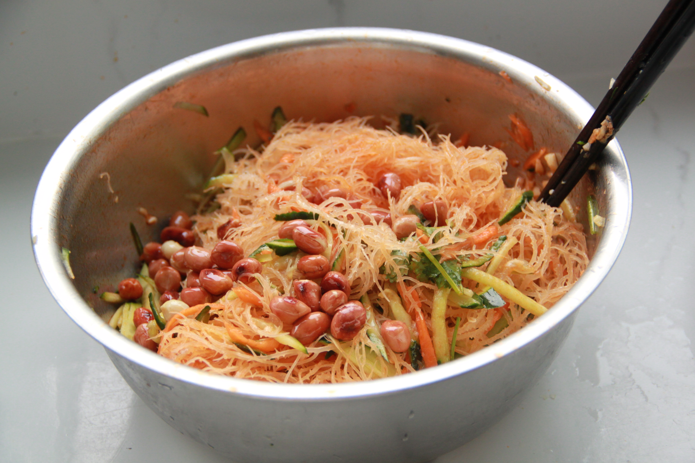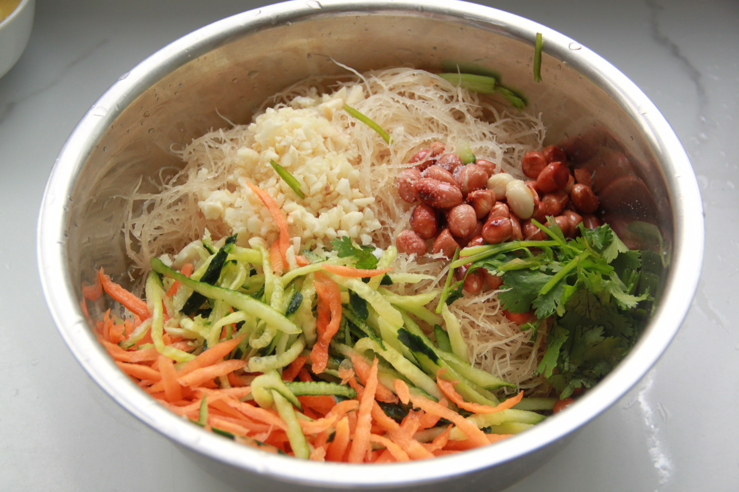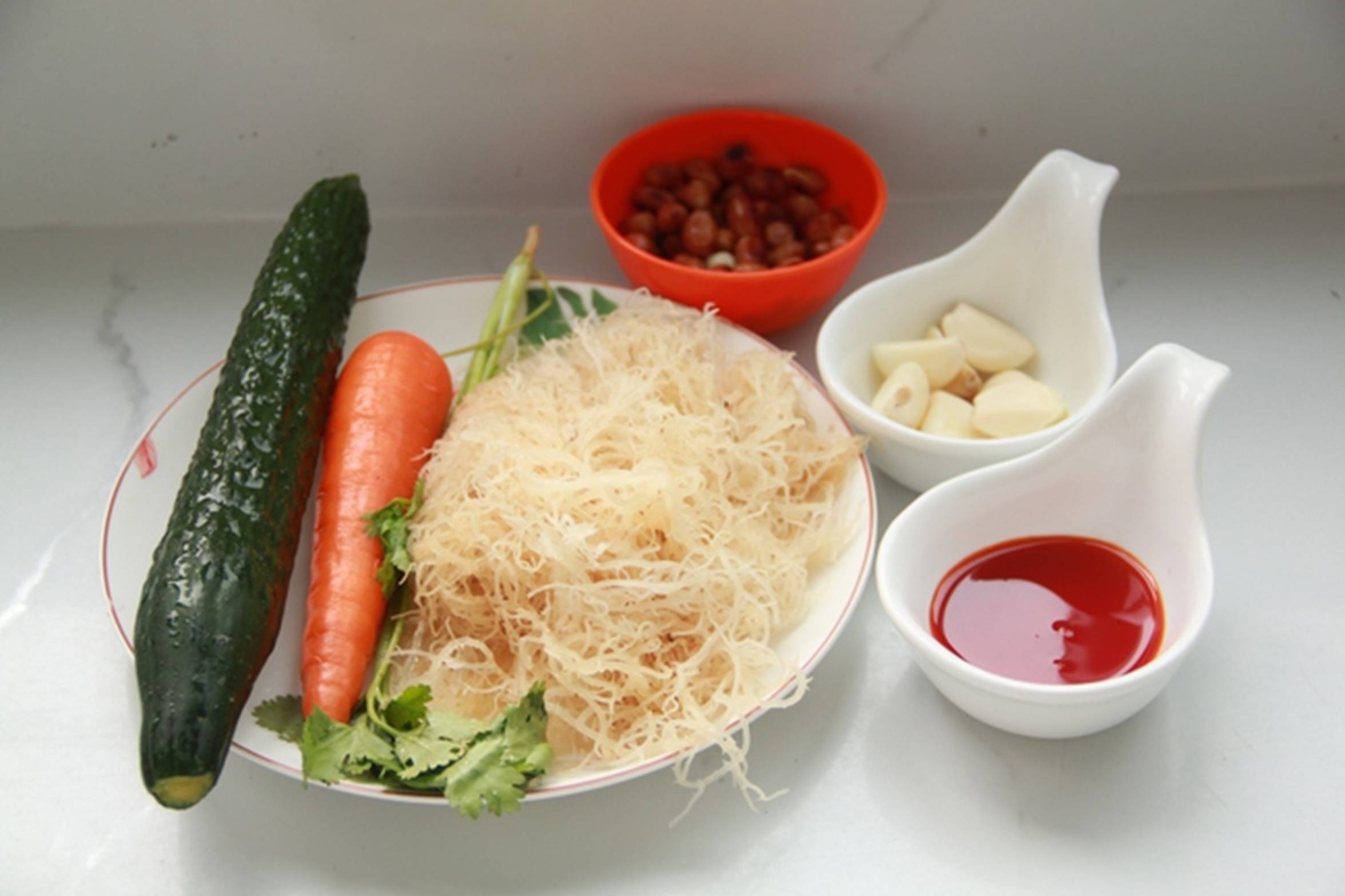 20g rong sụn khô (200g rong sụn tươi), 1 quả dưa chuột, 1 củ cà rốt, 10g tỏi băm, 2 quả ớt, một nắm lạc rang, lượng rau mùi vừa phải, 1 thìa tương ớt, 2 thìa vừng trắng, 40g dầu mè, 2 thìa nhạt nước tương, 1 thìa dầu hào, 1g muối, 1 thìa đường, 2 thìa giấm balsamic.
