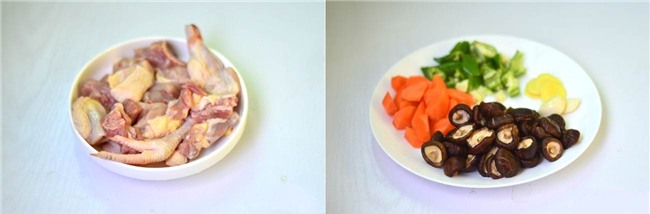 Gà rửa sạch chặt miếng vừa ăn. Cà rốt bào vỏ thái miếng vừa ăn, ớt sừng thái vát, nấm ngâm mềm rồi rửa sạch, gừng thái lát, tỏi bóc vỏ.
