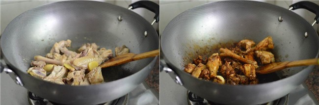 Đun nóng một ít dầu ăn trong chảo, cho gừng tỏi vào xào thơm. Thêm gà vào đảo cho gà săn lại thì thêm nước tương nhạt, nước tương đặc, rượu nấu ăn vào đảo cho đến khi gà chuyển màu nâu.