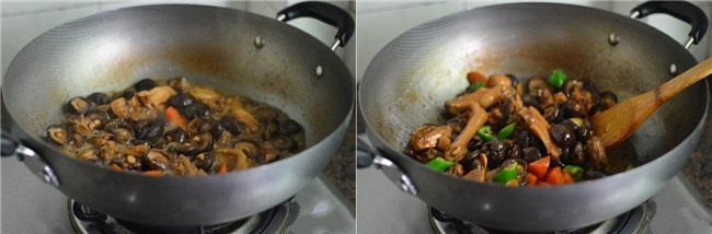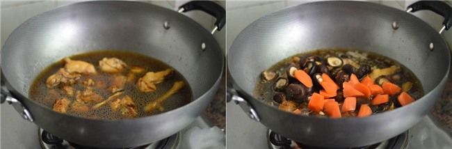 Thêm lượng nước vào xâm xấp mặt gà. Thêm nấm và cà rốt vào đun sôi rồi hạ nhỏ lửa đun khoảng 15-20 phút.