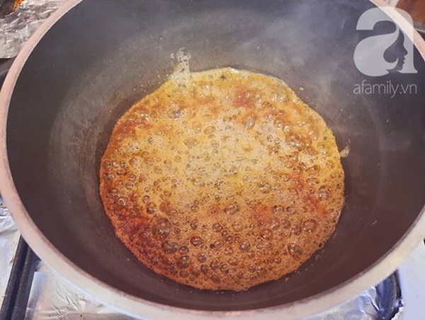 Đặt một chiếc nồi lên bếp, cho đường + 3 thìa nước vào thắng đường đến khi có màu nâu cánh gián.
