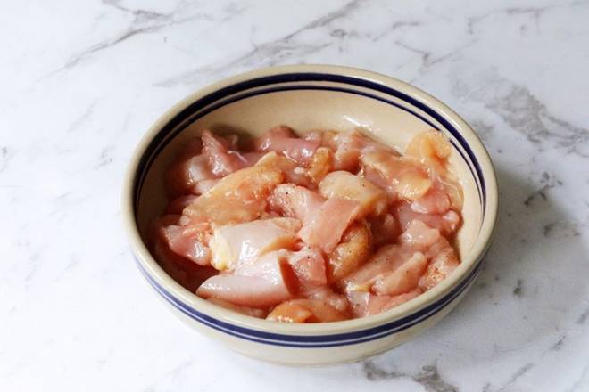 Ức gà rửa sạch, thái miếng vừa ăn, sau đó thêm các gia vị dành để ướp thịt vào, trộn đều.