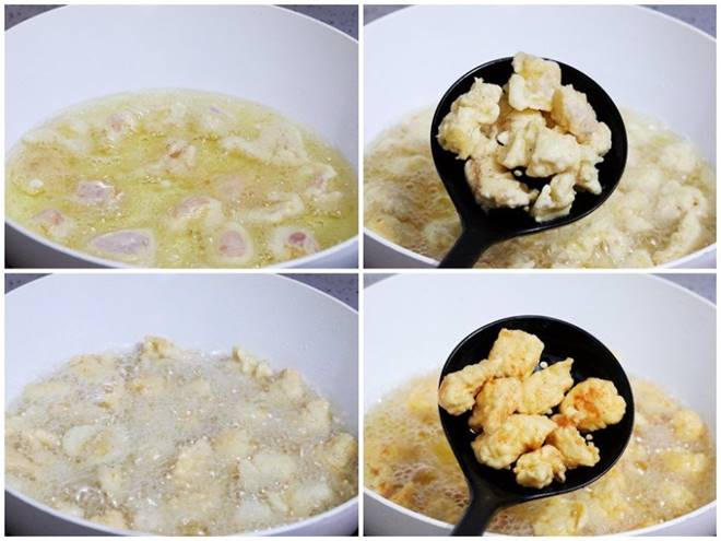 Đổ một lượng dầu ăn thích hợp vào chảo, đun nóng đến 70% rồi cho thịt gà vào chiên cho đến khi có màu vàng nhạt.