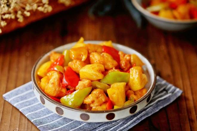 - 250g ức gà, 150g dứa, 1 quả ớt chuông xanh, 1 quả ớt chuông đỏ, 1 quả trứng, 50g tinh bột ngô, dầu ăn vừa đủ.