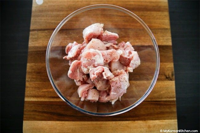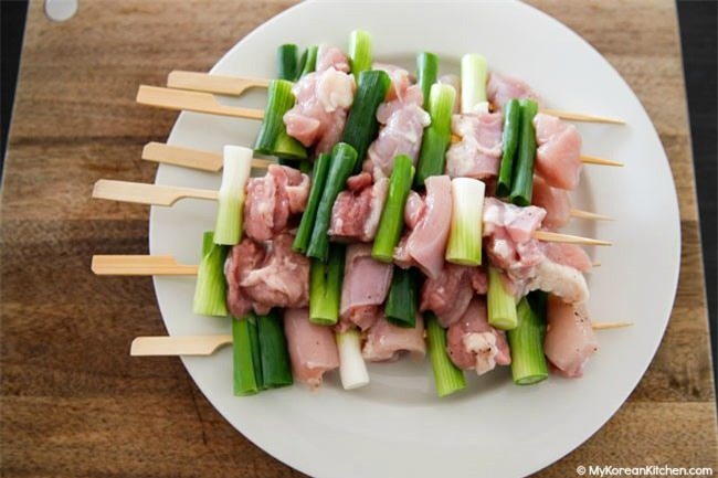 Ngâm xiên tre vào nước trước 30 phút. Thịt gà cho vào tô thêm rượu gạo, một ít muối, hạt tiêu vào trộn đều để chừng 10 phút cho ngấm.