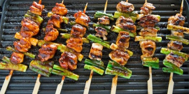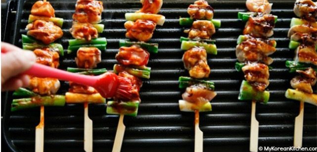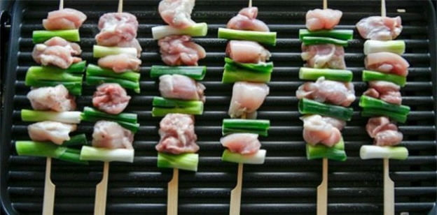 Phết 1 lớp mỏng dầu ăn lên mặt khay nước hoặc mặt chảo. Đặt xiên gà lên, nướng chừng 3 phút ở nhiệt độ vừa.