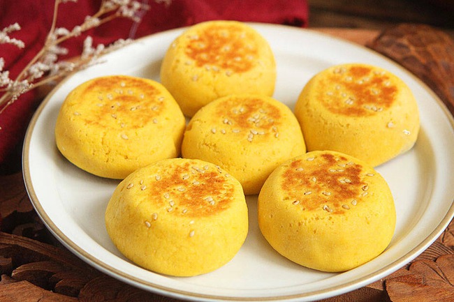 Bước 4: Không cần đổ dầu vào chảo, để chảo nóng trên lửa vừa, đặt bánh vào nướng đến khi ngả nhẹ màu một mặt thì lật sang mặt còn lại. Nướng áp chảo đến khi chín đều hai mặt. Hoặc bạn cũng có thể dùng lò nướng, nướng bánh ở nhiệt độ 190 độ C trong 5 phút. Có thể rắc chút vừng lên mặt bánh để trang trí.