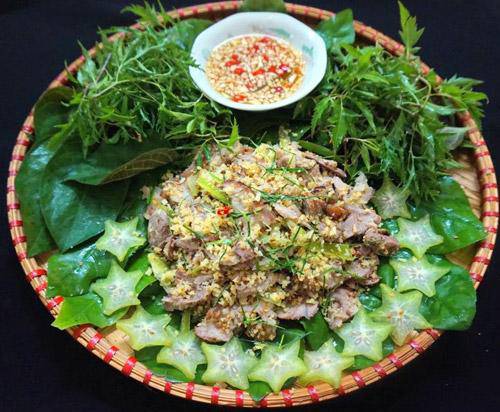 Thịt sau khi thái mỏng, trước hết đem bóp cùng với khế chua ở trên sao cho vị chua của khế ngấm vào thịt. Tiếp đến cho riềng đã giã nhỏ ở trên cùng vài lát ớt, chút gia vị nêm nếm cho vừa miệng. Cuối cùng rắc chút vừng, lá chanh và vài lát sả trộn đều là được.