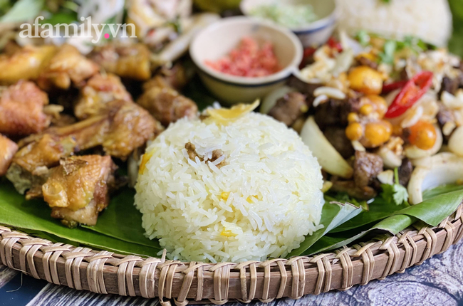 Khi gạo hút hết nước dùng gà thì cho rải gạo vào xửng, thêm lá nếp vào hấp tầm 30 phút là chín. Cho xôi vào chén, úp ra mẹt, xào mỡ hành cho lên xôi.
