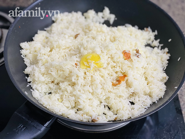 Làm nóng chảo, phi tỏi, gừng, nghệ cho thơm rồi cho gạo (đã vo nước sạch bụi) vào xào lên.