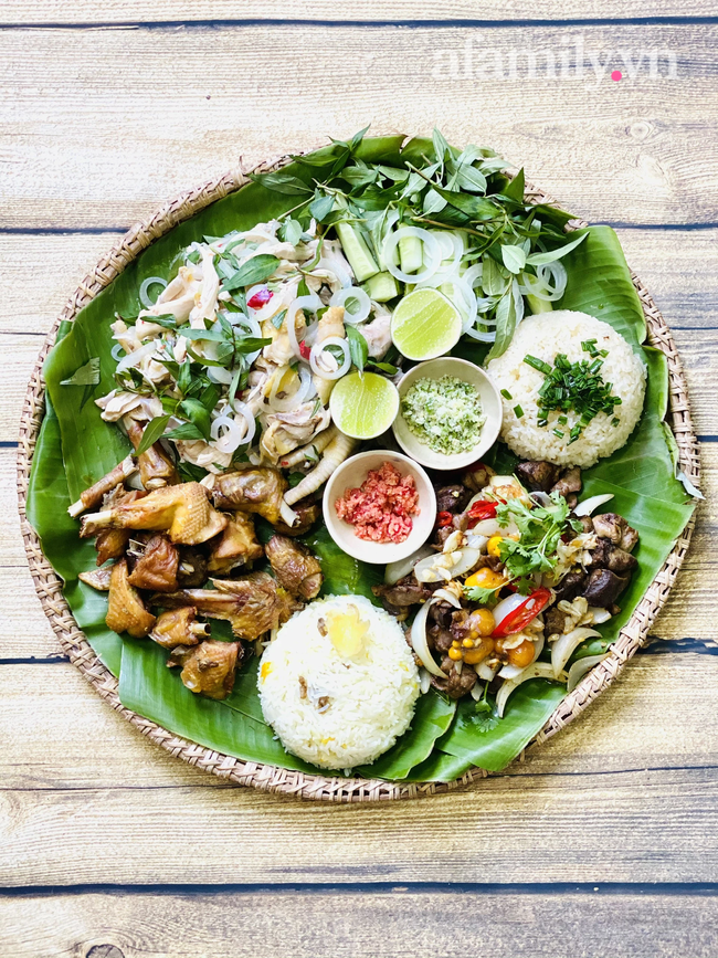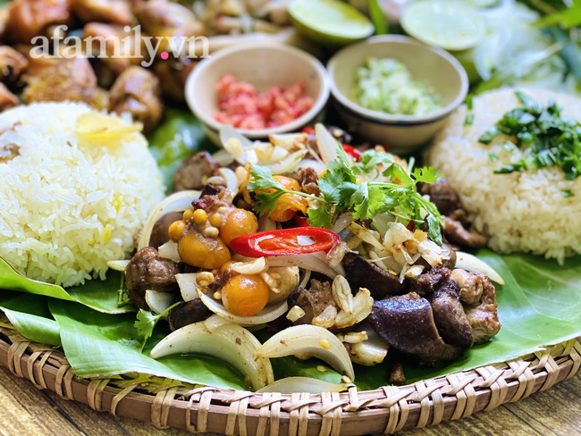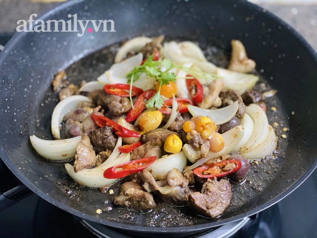 Khi tất cả đều chín thì cho hành tây đã cắt múi cau, ớt cắt lát vào, nêm nếm lại cho vừa khẩu vị. Cho lòng gà cháy tỏi ra mẹt, thêm cho phần tỏi phi vàng lên và trang trí một ít lá ngò.