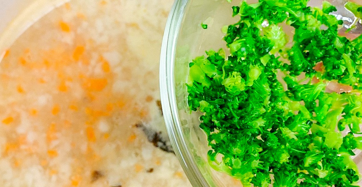 Bước 1: Cắt bông cải xanh cắt thành những nhánh nhỏ, rửa sạch sau đó chần với nước sôi 2 phút. Tiếp đó bạn thái nhỏ bông cải xanh. Gọt vỏ cà rốt, rửa sạch và cắt thành miếng hình hạt lựu nhỏ. Ngâm nấm mèo với nước ấm khoảng 15-20 phút cho nở mềm rồi rửa sạch và thái nhỏ (bạn lưu ý không ngâm nấm mèo quá lâu để tránh vi khuẩn sinh sôi gây độc cho cơ thể). Gọt vỏ và rửa sạch củ mài, dùng dao đập dập rồi băm nhỏ.