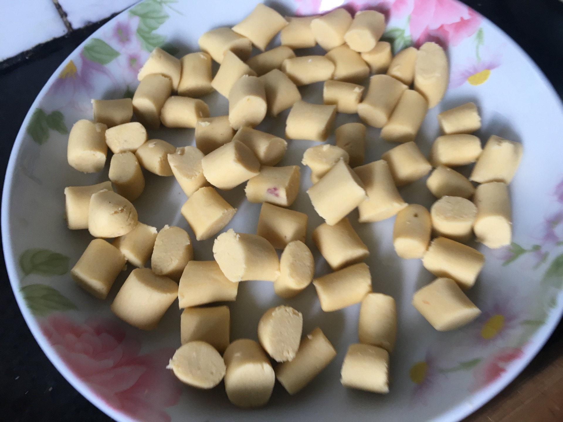 3 củ khoai lang tím, 1 củ khoai môn, 350g bột năng, 1 cốc nhỏ đậu đỏ, 1 ít bột đậu đỏ, lượng đường phèn thích hợp.