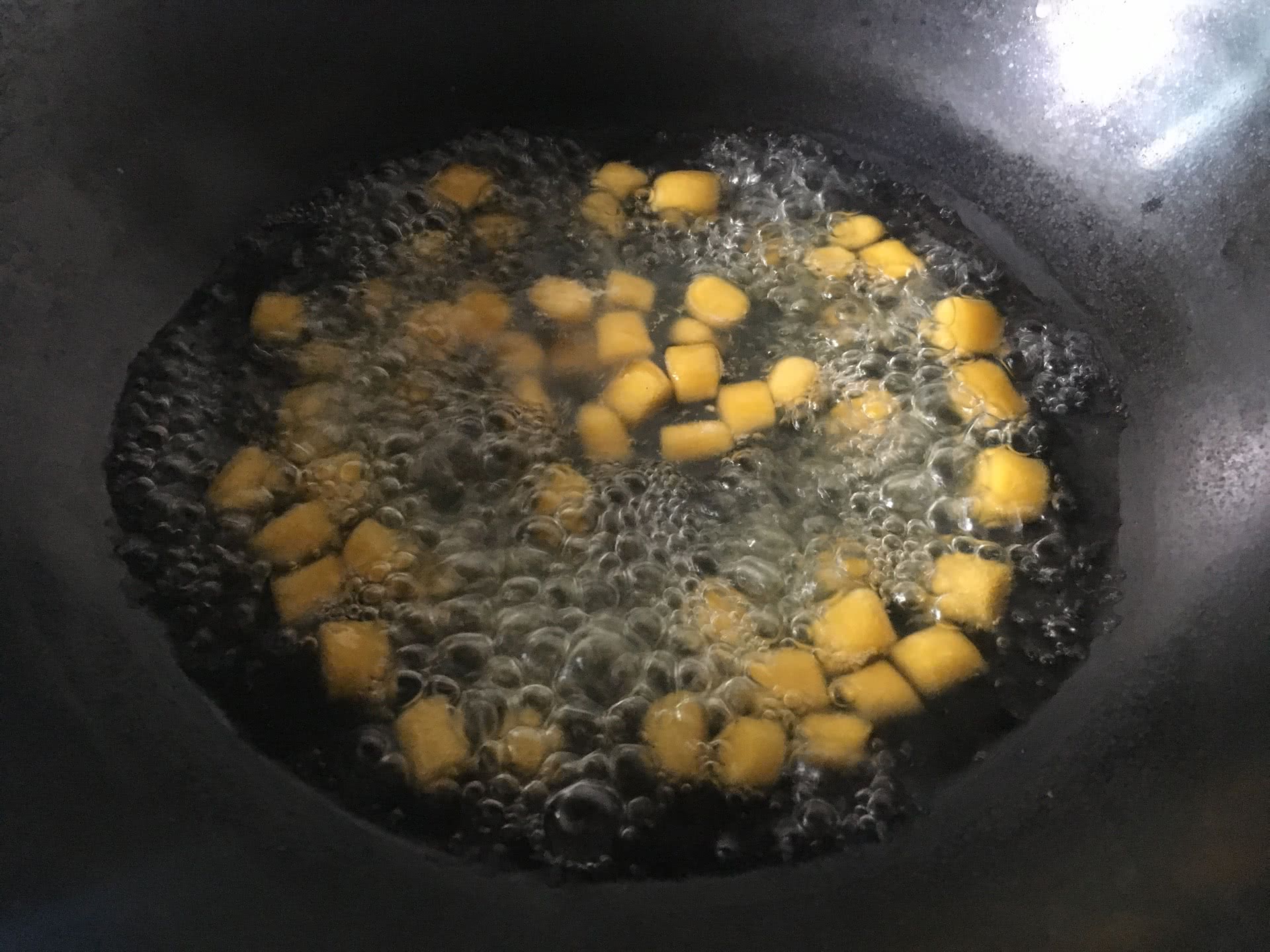 Bước 2: Cho nước vào nồi, đun sôi. Sau đó thả các miếng khoai vừa cắt vào nấu cho đến khi nổi và chín thì vớt ra, xả qua nước lạnh lần nữa rồi chắt cho hết nước. Đậu đỏ sau khi ninh nhừ thì chắt nước ra, sau đó cho đường phèn vào xào để hạt đậu ngấm đường thì đổ phần nước ninh trước đó (khuấy cùng bột đậu đỏ) vào. Đun sôi trong 10 phút để phần đường hòa quyện với nước.