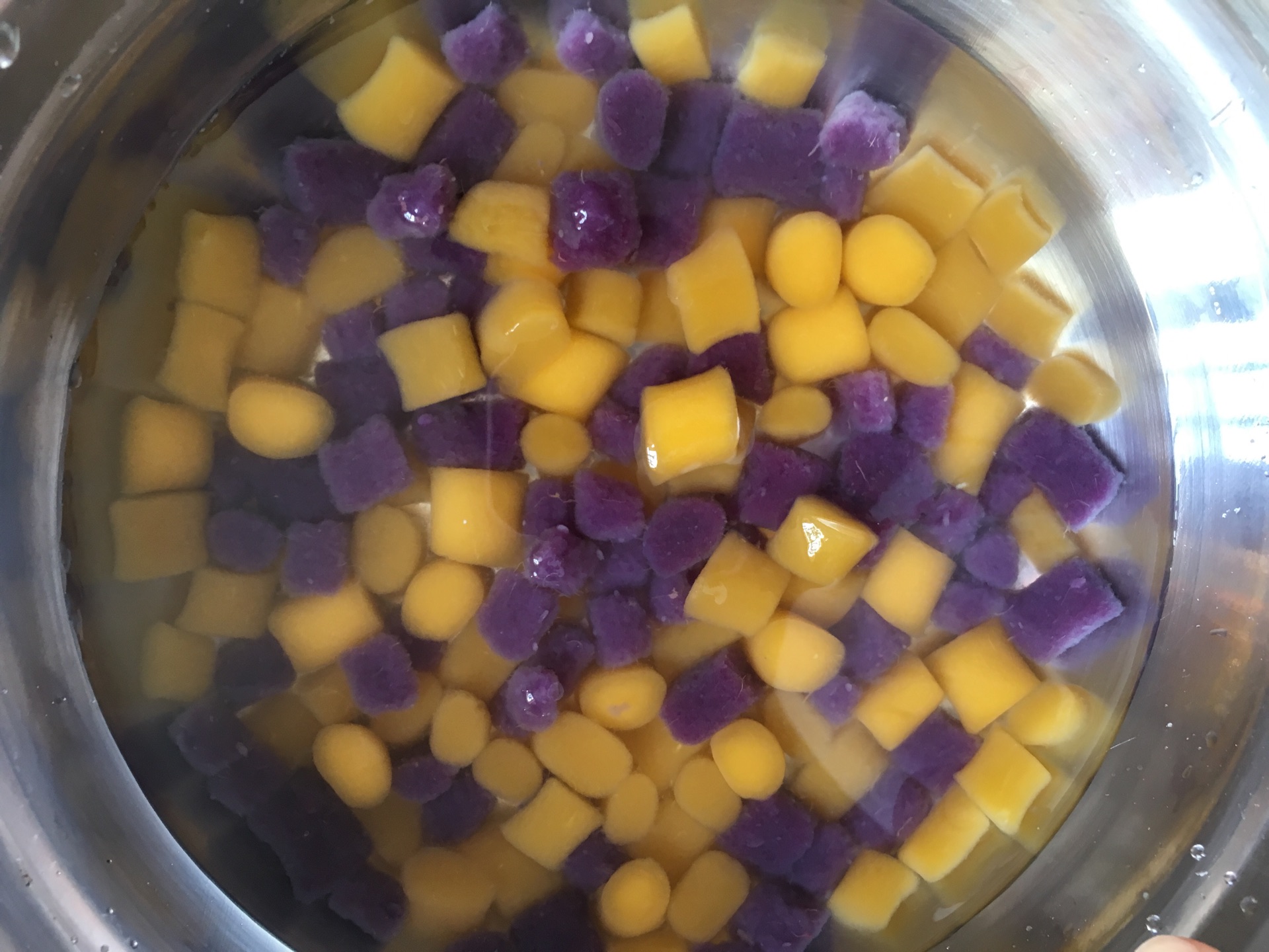 Bước 1: Khoai môn và khoai lang tím rửa sạch, gọt vỏ rồi cho vào nồi hấp, hấp trên lửa lớn đến khi chín thì lấy ra rồi nghiền nhuyễn. Để riêng từng loại. Lần lượt cho bột năng vào từng phần khoai rồi nhào thành khối. Khoai lang tím tương đối khô nên cho một ít nước vào nhào đều. Sau khi đã nhào bột xong thì lần lượt vo thành từng dải mỏng và cắt thành từng miếng nhỏ. Đậu đỏ rửa sạch cho vào nồi áp suất ninh nhừ.