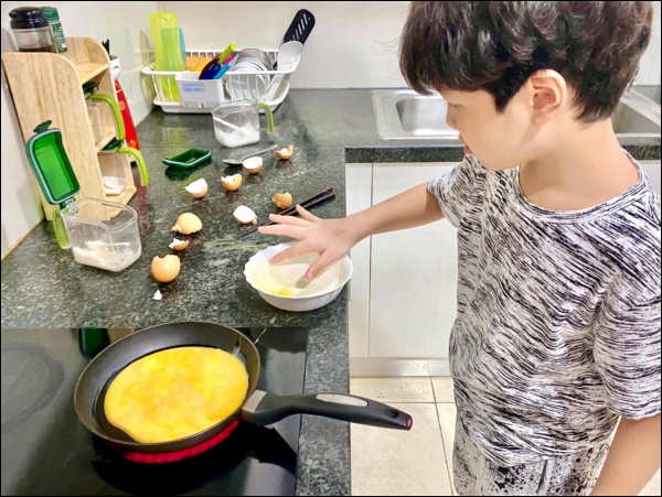 Không chỉ thế, Đan Lê còn hướng cậu con trai cả Khải Minh tự vào bếp thực hiện món trứng rán đơn giản. Tuy thành quả không được như mong muốn nhưng để con tự làm là cách cô giáo dục con yêu lao động và tự phục vụ bản thân.