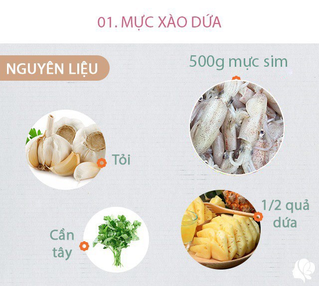Nguyên liệu: - 500g mực sim - 1/3 quả dứa chín vừa - vài cây cần tây, 1 củ tỏi, 1 củ gừng nhỏ - Gia vị xào mực: Hạt nêm, dầu ăn, hạt tiêu