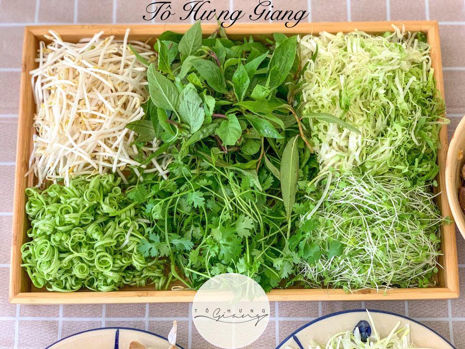 - Hoa chuối, giá đỗ, rau húng, mùi ta, xà lách Đà Lạt nếu có, rau răm...