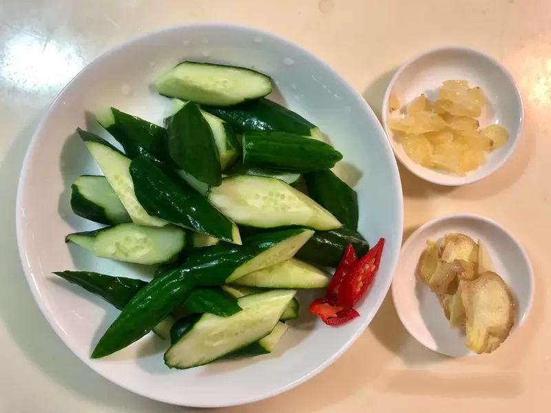 Dưa chuột rửa sạch, thái dưa chuột thành miếng vừa ăn. Ớt thái lát, tỏi băm nhỏ, gừng thái lát.