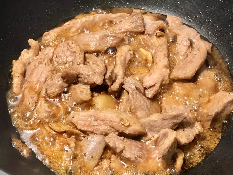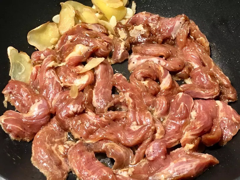 Tiếp đó đổ thịt đã ướp vào đảo đều. Đậy nắp chảo và đun khoảng 3 phút.