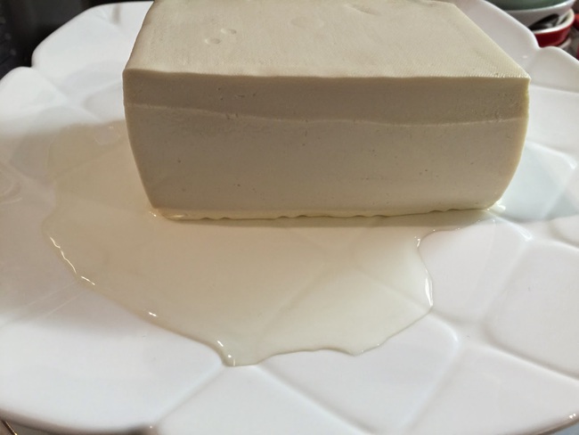Bạn rửa sạch đậu hũ, sau đó đặt miếng đậu lên 1 chiếc đĩa và dùng 1 chiếc đĩa khác úp lên, chèn thêm cả 1 chiếc chày lên nữa. Mục đích của việc này là để ép bớt nước trong miếng đậu hũ. Bạn chèn miếng đậu như vậy khoảng 5-7 phút là sẽ thấy nước chảy ra khá nhiều.