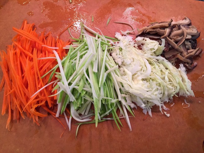 Bạn nạo vỏ cà rốt, rửa sạch và bào thành dạng sợi. Thao tác tương tự với dưa leo. Bắp cải rửa sạch, thái sợi nhỏ. Nấm đông cô bỏ phần chân nấm và thái nhỏ.