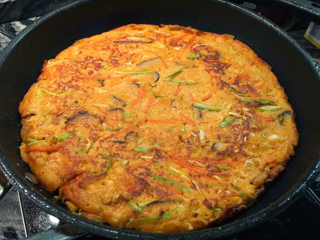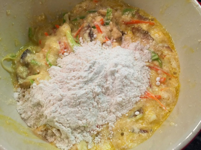 Bạn cho miếng đậu hũ đã ép nước vào bát, dùng thìa dằm nhuyễn. Sau đó, thêm vào bát đậu hũ phần rau củ đã bào nhỏ, 3 quả trứng, 1 thìa canh tương ớt, 1 thìa canh tương cà, 1 thìa cà phê muối, dùng đũa đánh đều để các nguyên liệu quện vào nhau.