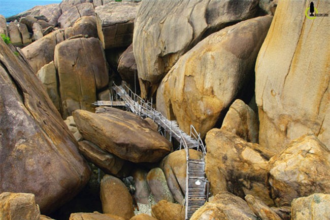 Một con đường hoàn toàn bằng tre độc đáo nằm xuyên giữa những khối đá khổng lồ ở Bình Ba, nơi đưa bạn đến với những khu dịch vụ chỉ có duy nhất ở bãi Nồm.