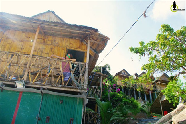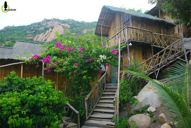 Từng căn hộ biệt lập đều hướng ra phía biển, xây dựng hoàn toàn bằng các vật liệu tự nhiên: sàn gỗ, mái lá, vách tre nứa cùng hoa giấy phủ kín lối vào.