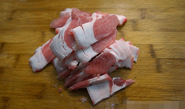 5. Lấy một cái chảo, đổ một lượng dầu thích hợp, đun lửa to đến 50%, cho thịt ba chỉ đã thái mỏng vào xào một lúc trên lửa nhỏ.