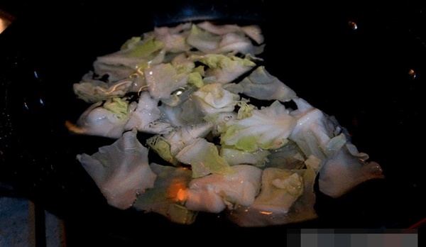 6. Sau khi thịt ba chỉ vàng nâu thì cho gừng, tỏi và ớt vào xào cho thơm, nêm một thìa xì dầu vào, cho bắp cải vào xào đều tay, nhanh trong nửa phút trên lửa lớn.