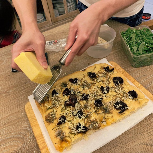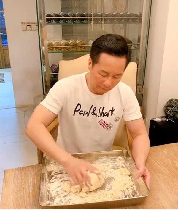Nhìn đại gia Đức An nhào bột, bạn bè còn trêu "Nhồi bột bằng tay như vậy lát khỏi đi gym", ông xã Phan Như Thảo cũng dí dỏm đáp lại "Anh nhồi quen rồi tay rất khoẻ".