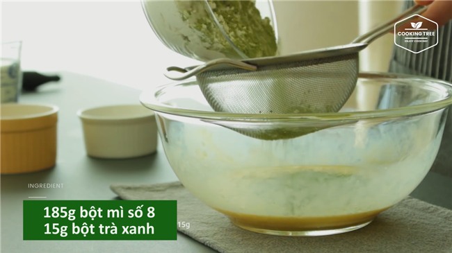 Rây vào tô trứng 185g bột mì và 15g bột trà xanh. Thêm vào tô 50g đường và 2g muối, dùng phới trộn đều.