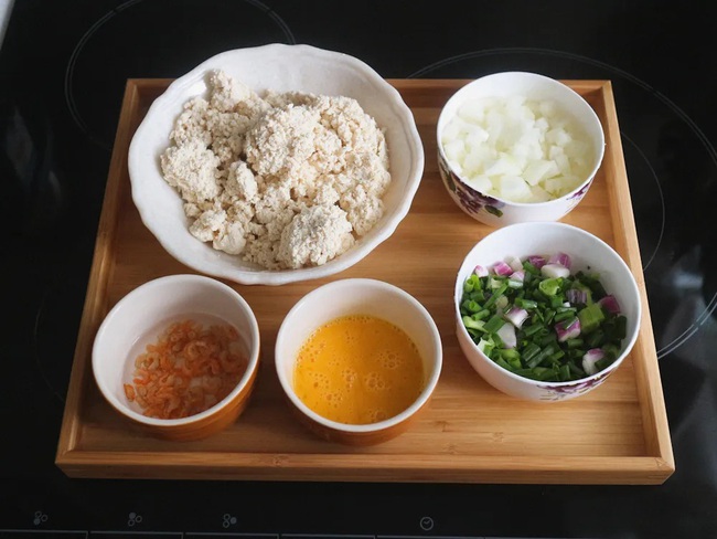 Bước 2: Cho đậu phụ vào một cái bát. Đập trứng vào một bát khác, nêm chút muối rồi đánh tan. Tôm khô ngâm nước vài phút. Hành lá và hành tây thái nhỏ.