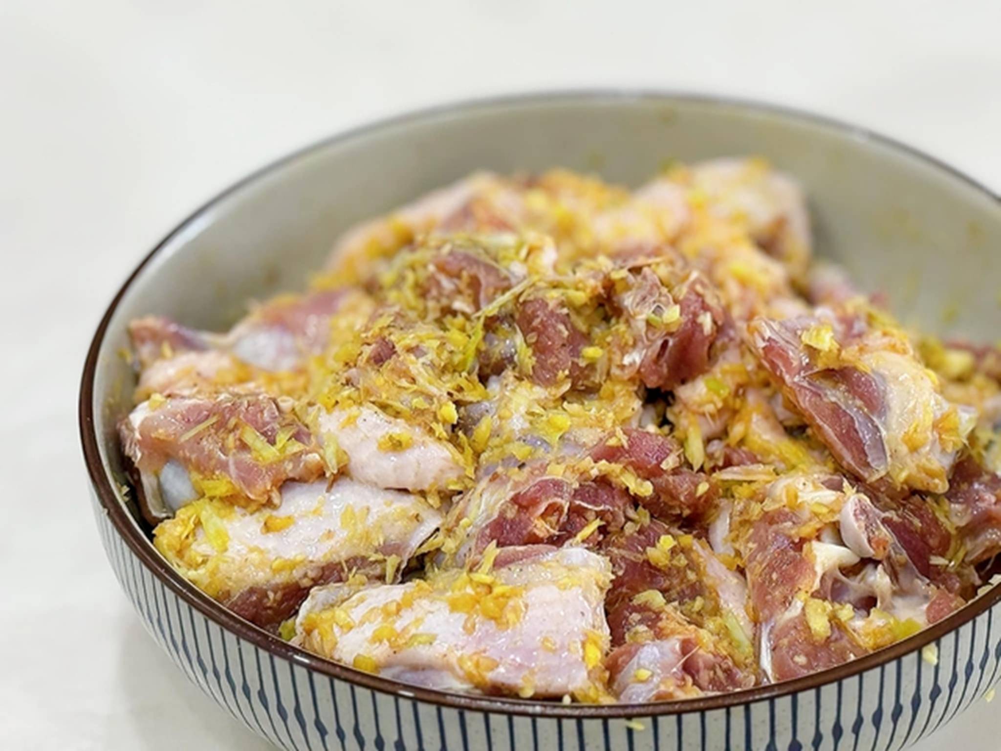 Cho thêm 2 thìa bột chiên giòn vào thịt vịt đang ướp.