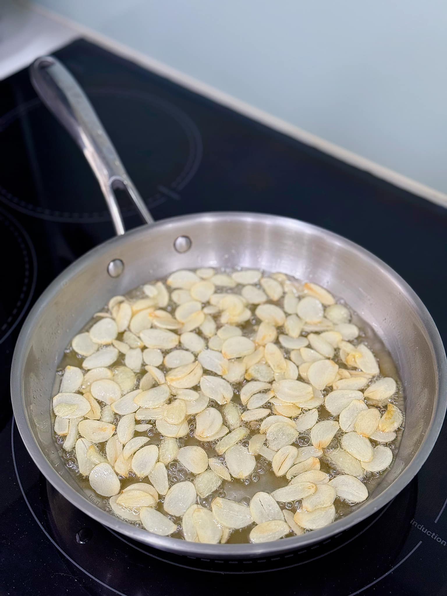 Bước 4: 3 củ tỏi to, bóc vỏ, thái lát, đem chiên vàng vừa tới, vớt tỏi để riêng. (Lưu ý, sau khi thái có thể đem tỏi đi ngâm với nước lọc pha chút giấm để hạn chế đắng từ tinh dầu tỏi và giúp tỏi giòn hơn, cũng như giữ được độ giòn lâu hơn).