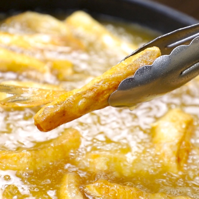 Bạn đổ 200gr bột chiên giòn ra bát. Lăn từng miếng cá hồi vào bát bột rồi thả vào chảo dầu nóng. Chiên vàng các mặt. Chị em nhớ lăn bột thật kỹ để các mặt cá đều được tẩm bột. Như vậy lúc chiên xong cá sẽ có màu vàng đẹp mắt.