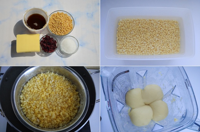Chuẩn bị nguyên liệu làm bánh đậu xanh vị việt quất: 200g đậu xanh đã cà vỏ, 50g bơ lạt, 65g đường cát, 25g mạch nha hoặc mật ong, 30g việt quất sấy khô, một ít bột đậu nành hoặc bột gạo nếp rang chín.