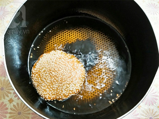 Cho nhiều dầu vào chảo đun cho nóng dầu sau đó vặn lửa nhỏ vừa, cho 1 cái bánh vào chiên, bánh sẽ nở từ từ sau đó bạn dùng 2 đầu đũa ấn nhẹ 2 bên mép bánh cho bánh nở phồng to hơn, trở mặt bánh và chiên tiếp cho tới khi bánh chín vàng đều.