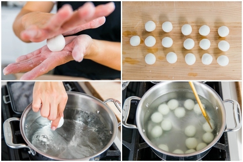 Bước 4: Dùng tay để vê tròn từng viên bột. Ngay trước khi luộc bánh trôi thì hãy chuẩn bị một bát nước đá lạnh để sang một bên. Đổ lượng nước thích hợp vào nồi rồi đun sôi sau đó cho bánh trôi vào luộc. Thỉnh thoảng khuấy nhẹ, đều để bánh trôi không bị dính vào nhau.