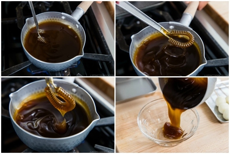 Bước 7: Cho đường, nước tương, rượu, nước lọc và tinh bột ngô vào nồi nhỏ khuấy đều rồi bật lửa nhỏ, vừa đun vừa khuấy đều.